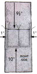 2) Cut two 9-1/2" x 12-1/2" rectangles for the appliqu�s background. Lay blocks out in a pleasing manner, following diagram below, orienting the darker triangles in the same direction. Piece four sets of three blocks together for sides of appliqu�s block, add to the appliqu� block top of bottom. Piece two sets of six blocks, add this to ends of appliqu� blocks, keeping block orientation, Piece thirty-six blocks, set 6 x 6 to make center panel, pressing each row's seam allowances in opposite directions, so seams abut. Piece these three sections together to make your table runner. Diagram 2