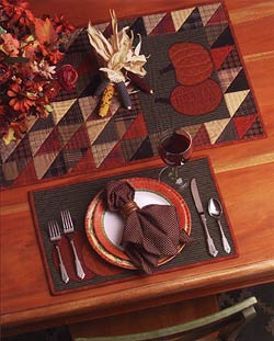 4) Cut eight 12-1/2" x 18-1/2" rectangles from your green homespun fabric. Trace four tall pumpkins, four short pumpkins, and eight stems, fuse to corner of placemat following instructions above for table runner. (See project sheet for appliqu� outlines) Layer rectangles together with cotton batting in middle and quilt as desired. See picture for quilting ideas. Bind with rust fabric, using your favorite method.