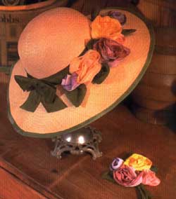 Make 5" bow with 3" tails and attach to back of hat. Arrange in a pleasing manner and stitch large roses, medium roses, buds, and leaves onto crinoline strip. Slash crinoline as necessary to allow flowers to hug crown. Trim crinoline close to flowers. Stitch in place on hat crown.